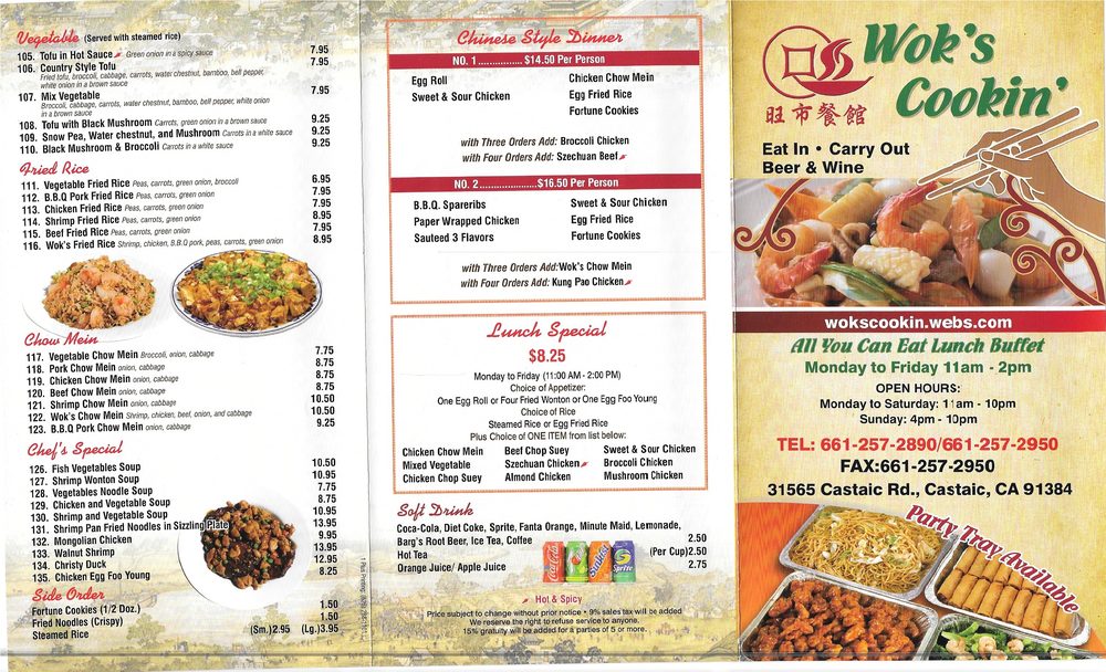 Discover the hidden gem of Castaic, CA – Wok’s Cookin’. Known for its authentic Chinese cuisine, this casual spot offers a tranquil ambiance perfect for any occasion. With a menu filled with flavorful dishes like hot & sour soup, General Tso's chicken, and tasty lunch specials starting at $13.99, there's something for every palate. Customers rave about the friendly staff, efficient service, and generous portion sizes. Whether you're dining in or opting for takeout, Wok’s Cookin’ ensures a satisfying experience every time. Don't miss out on their delicious potstickers, sesame chicken, and Szechuan pork with eggplant. Make sure to grab a seat at their covered outdoor seating area or indulge in their convenient delivery options. Wok’s Cookin’ is a top choice for those craving quality Chinese fare in the area.